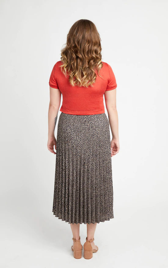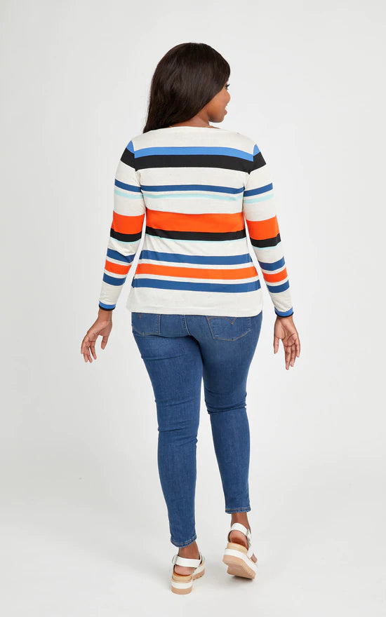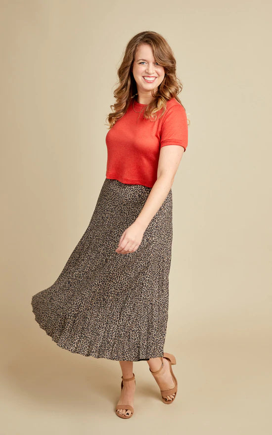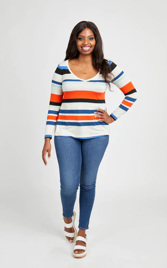 Faith (orange, blue, and white stripes) is wearing a size 8 C/D graded to a 12 waist and 14 hip. Her measurements are high bust 34", full bust 37", waist 32", hip 44", and she is 5' 5”.