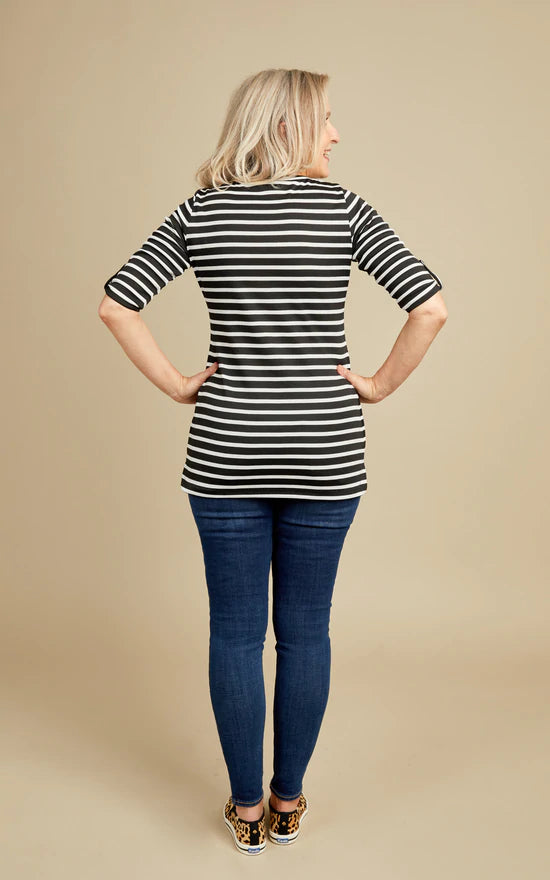 Suzi (black and white stripes) is wearing a size 6 E/F. Her measurements are high bust 33", full bust 37", waist 28", hip 38", and she is 5' 6”.