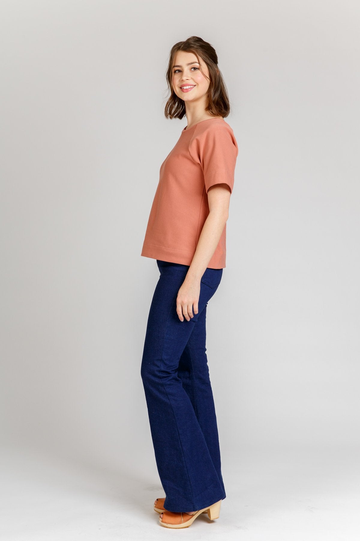 Pattern can be made up in a variety of fabrics to different effect. Woven fabrics idea for Versions 2 & 4 include light to medium weight dress or shirting fabrics such as cotton, wool, linen, denim, chambray, silk, rayon crepe, etc. Knit fabrics with little stretch ideal for Versions 1 & 3 include stable knits such as ponte, scuba, neoprene or double knit. Light to medium weight knit fabrics may be used, but will result in a looser, drapier garment.
