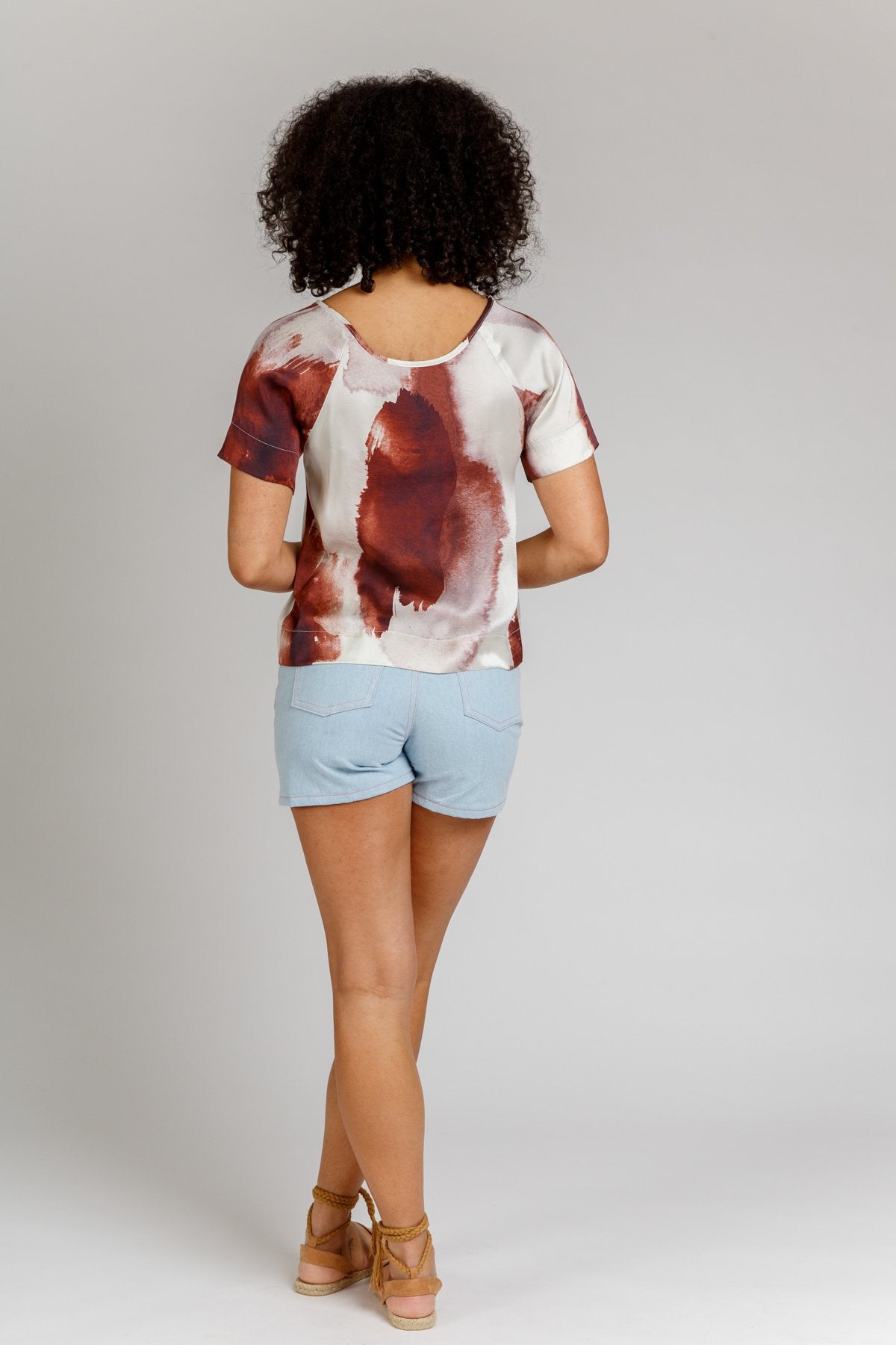 Reversible raglan dress or top that can be made in woven or knit fabrics. Pattern features loose fit, optional pockets and waist tie, as well as top and dress options. It can be worn with the V neck or the round neck side at the front.