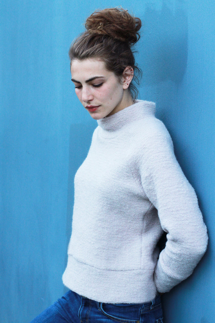 Sweater #1: Is a closer fitting, semi-cropped sweatshirt/sweater. It works best when sewn in thick, stiff knits with some body to keep the neck standing upright. It features raglan sleeves, a wide waistband, a loose turtleneck, long cuffs and falls between the high and low hip. It’s great in a standard sweatshirt fleece (with stretch) however, it’s also extremely handsome in a sweater knit to dress it up a bit.