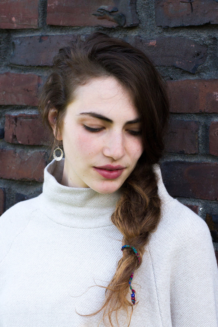 Sweater #2: Is an easy top/sweater that can be dressed up or down. It is somewhat fitted through the shoulders and sleeves and then swings out a bit at the underarms and hem. It features a semi-high-neck that takes its inspiration from funnel and boat necks. It also has mitered side vents with a hi-low hem that is 1” shorter in the front than the back. The front hem falls just below the high hip. Sew it in a boiled wool knit, a wool jersey or ponte for a more dressed up look. Sew it in a sweatshirt fleece (with stretch) or jersey knit for a more casual look.