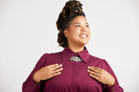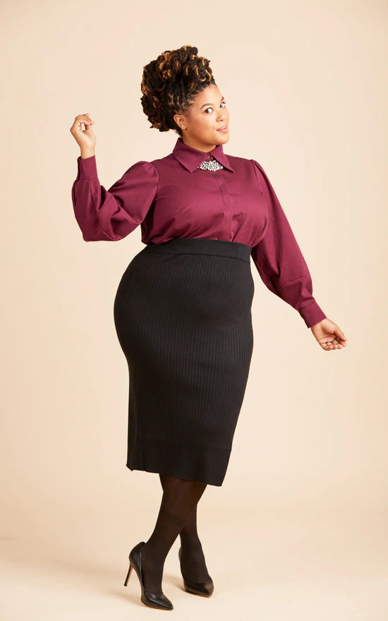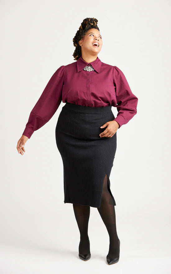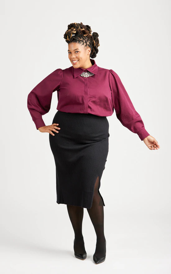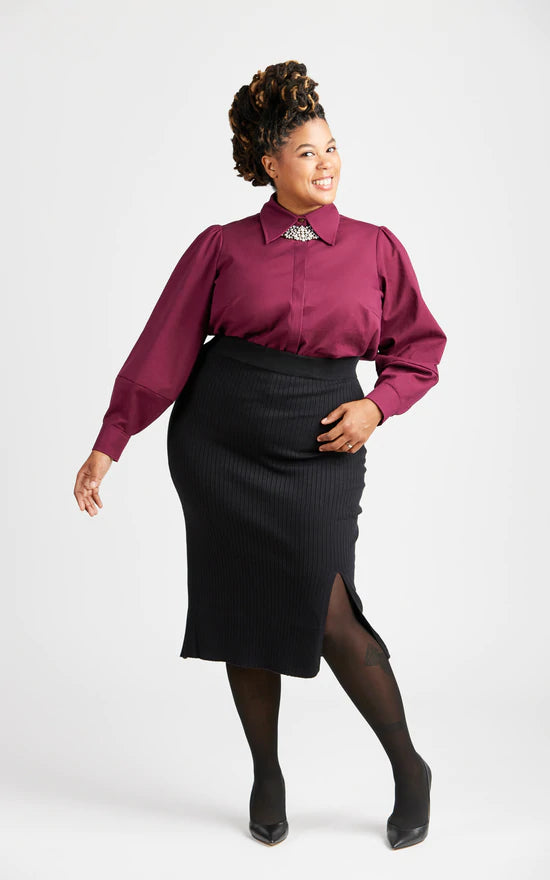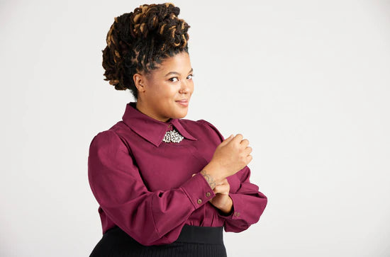 Reclaim the button-up with the Vernon Shirt! This boob-friendly take on the essential button-up shirt features two views: View A is a classic shirt with a traditional collar and collar stand, and full sleeves with narrow cuffs. View B is a fashion-forward version with a dramatic collar, covered button placket, and lantern sleeves with wide cuffs.