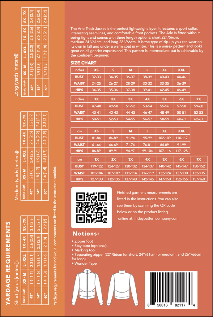 The Arlo Track Jacket is the perfect lightweight layer. It features a sport collar, interesting seamlines, and comfortable front pockets. The Arlo is fitted without being tight and comes with three length options: short 22”/56cm, medium 24”/61cm, and long 26”/66cm. It is the type of zip-up you can wear on its own in fall and under a warm coat in winter. This is a unisex pattern and looks great on all gender expressions! This pattern is intermediate but is achievable by the confident beginner.