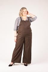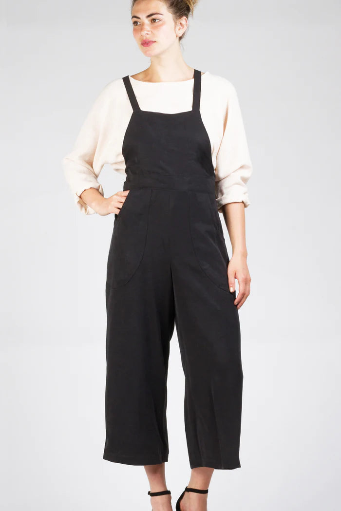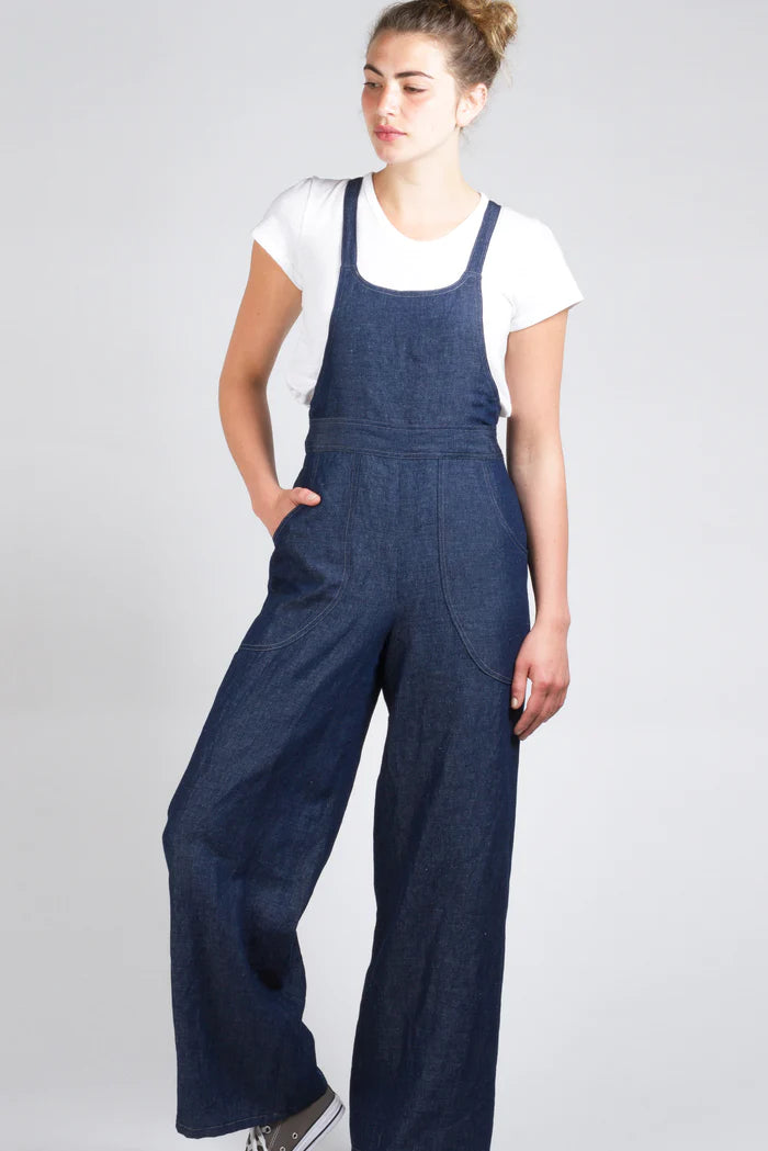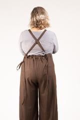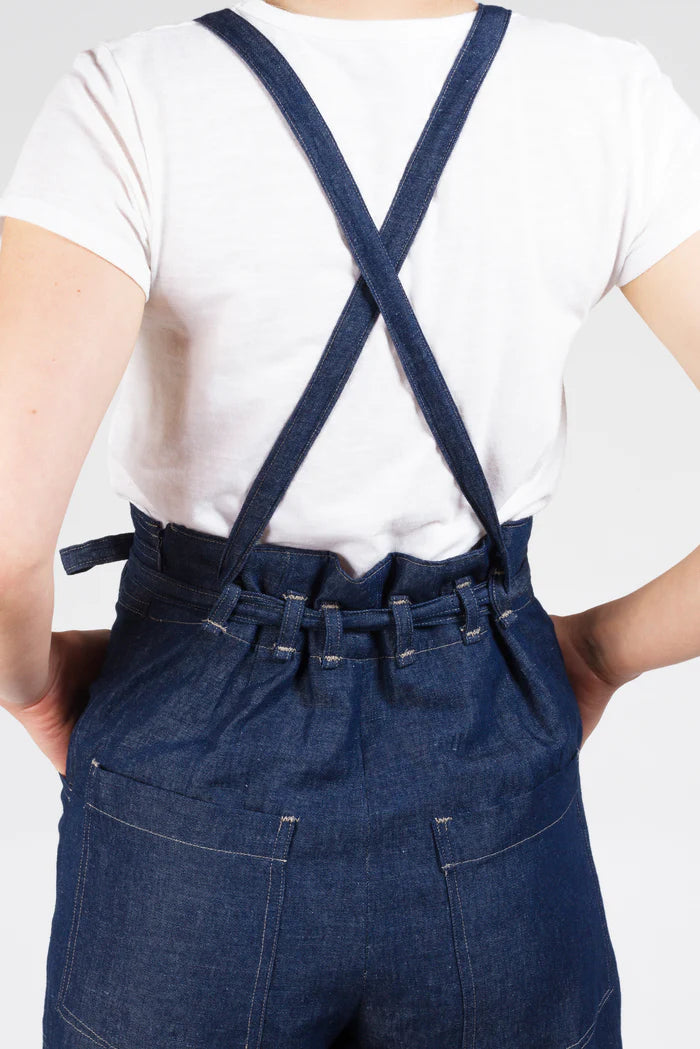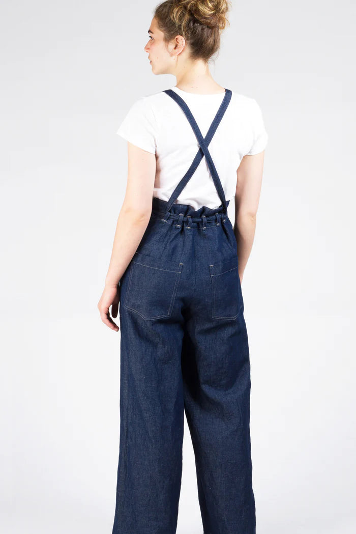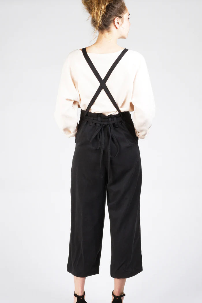 Both versions also feature a front waistband, curved front patch pockets, optional back pockets, and cross-back straps that transition to narrower ties that thread through back waist belt loops forming back waist gathers. They may be tied in many ways - at the back, front or sides. The wide leg can be made full length or cropped.