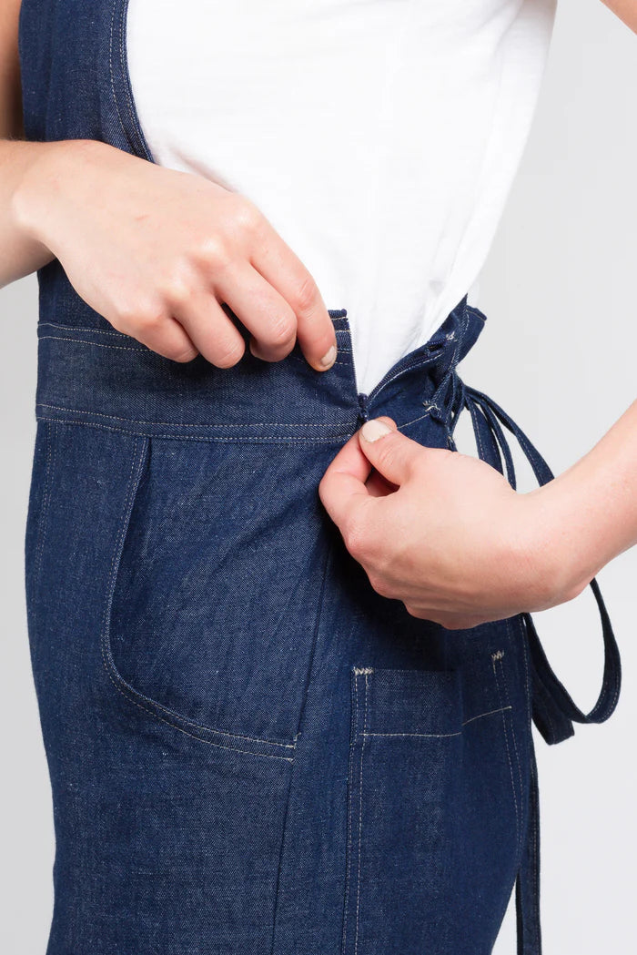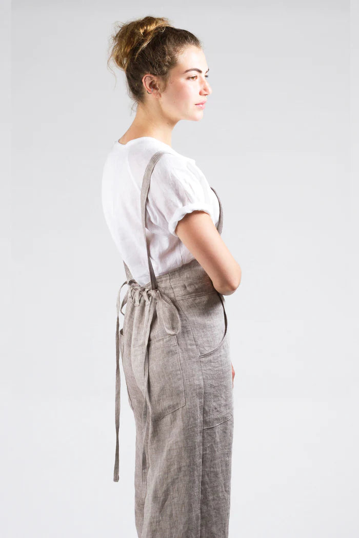 The Burnside Bibs are versatile overalls that can be dressed up or down. Shoulder straps transition to narrow ties with several options for tying.