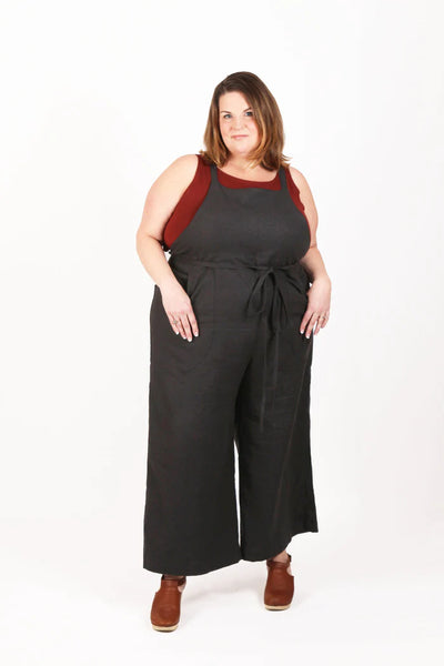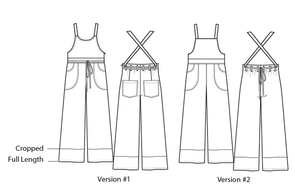 Both versions also feature a front waistband, curved front patch pockets, optional back pockets, and cross-back straps that transition to narrower ties that thread through back waist belt loops forming back waist gathers. They may be tied in many ways - at the back, front or sides. The wide leg can be made full length or cropped.