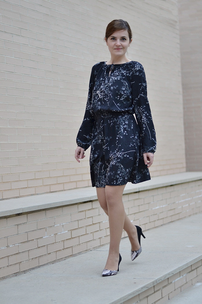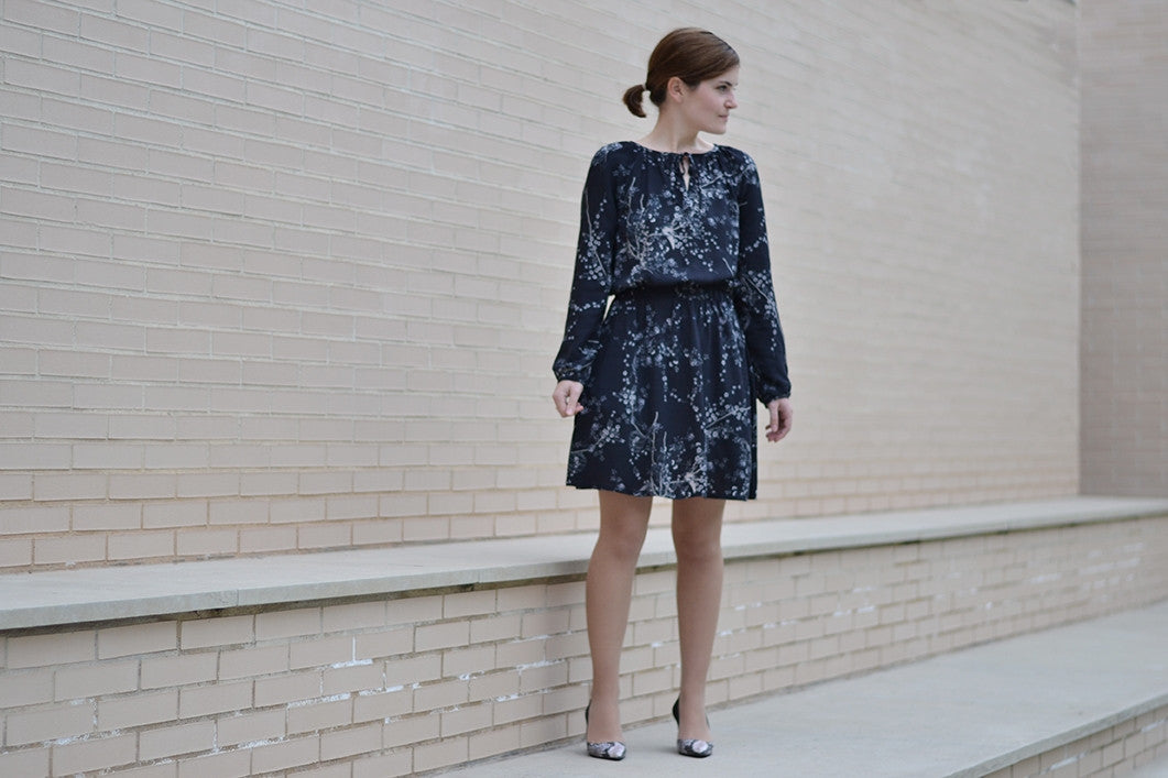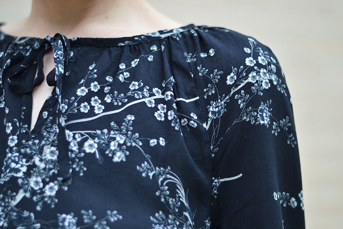 The Eliana dress is a semi-fitted dress with gathered neckline and waist. The flowy skirt has inseam pockets and hits just above the knee.