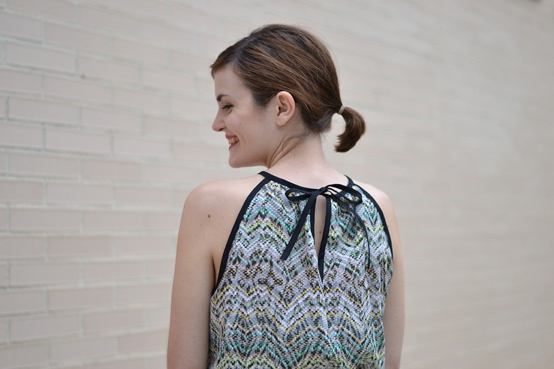 View B is sleveless, has a back opening and ties at the waist with a grosgrain ribbon.
