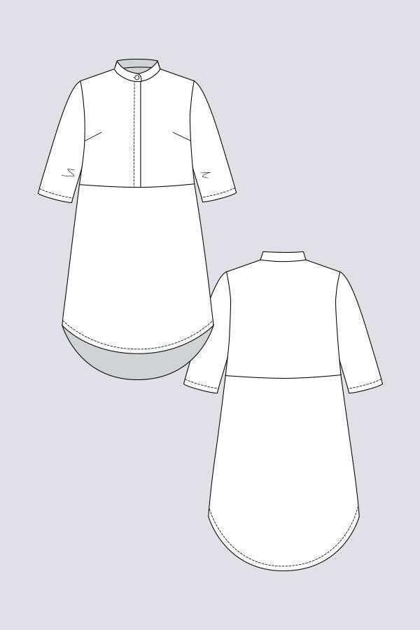 The Helmi pattern includes two variations with details you can mix and match! The straight-cut blouse has elements from the classic trench coat, such as the cape and sleeve straps. The rounded collar and slightly curved hem with slits add a touch of soft femininity. The more streamlined tunic variation is also straight-cut and has a simple stand-up collar, half sleeves, and a curved hem. Both variations have a discreet and elegant hidden button placket.