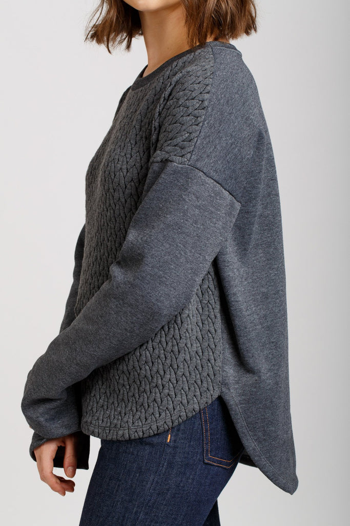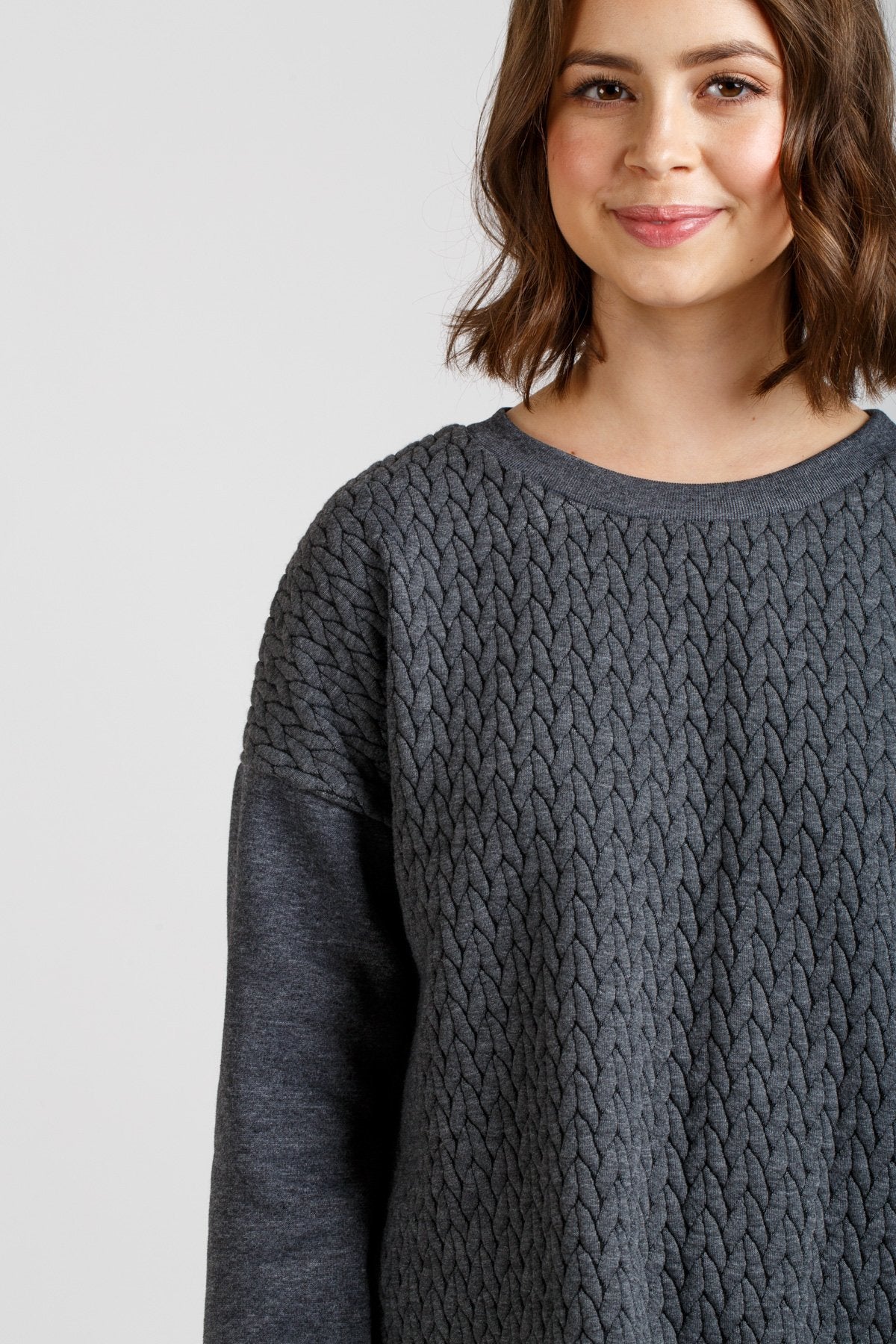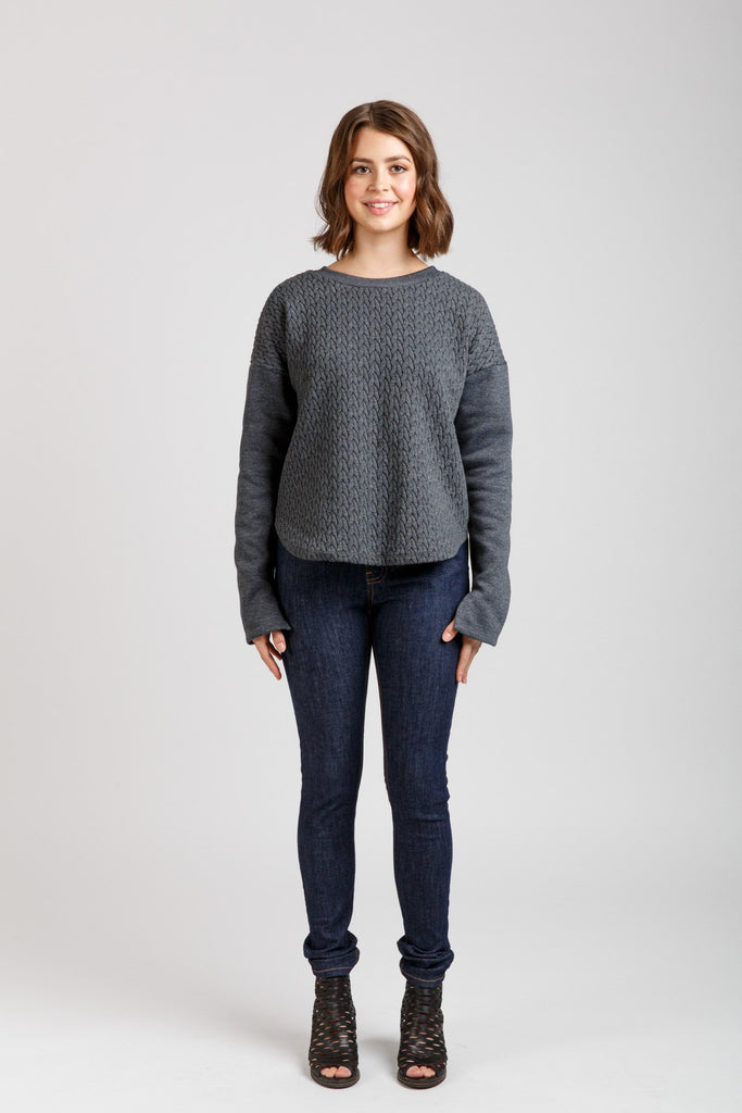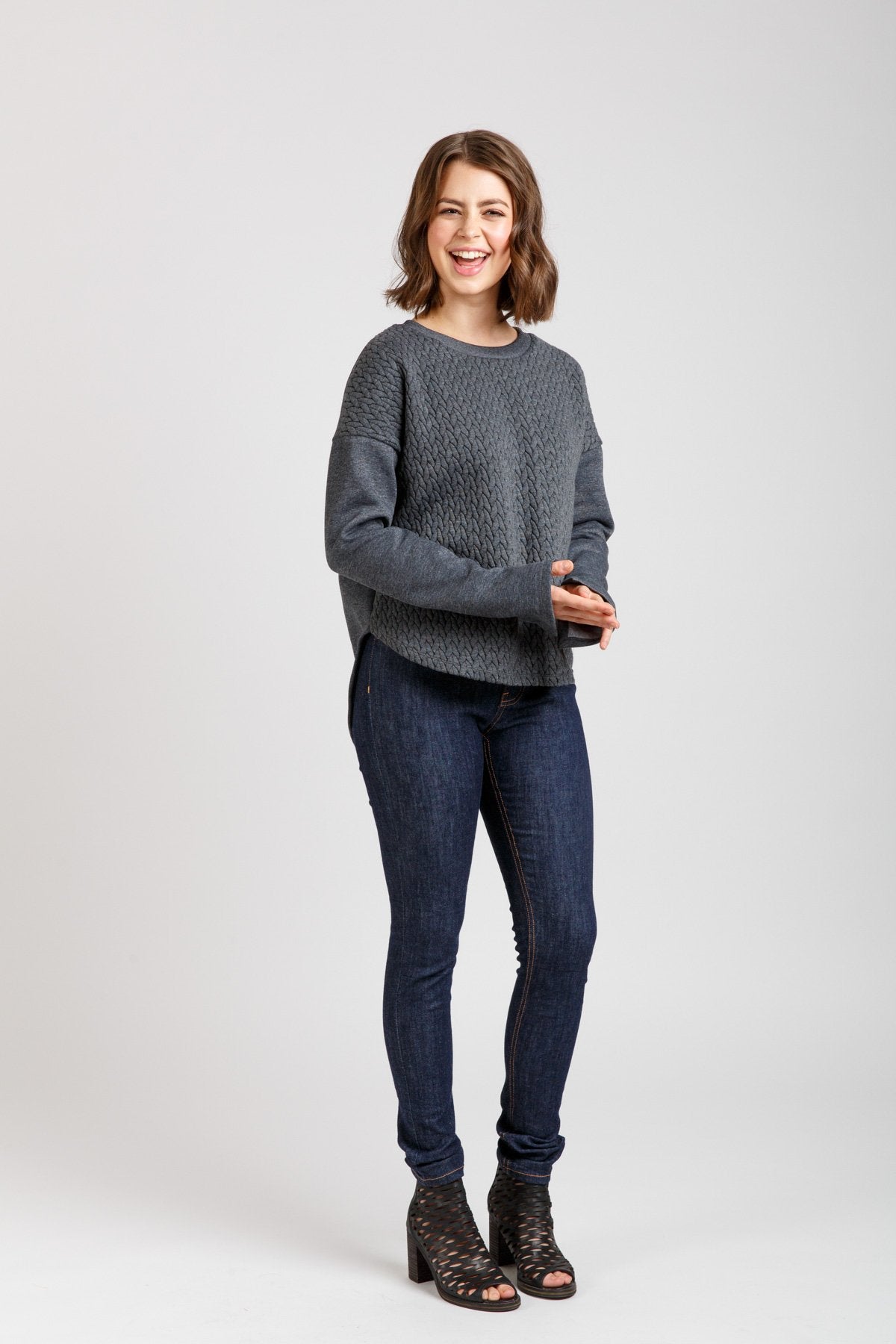 Loose fit drop shoulder sweater. Pattern features a crew or funnel neckline, two sleeve options and four hem styles.
