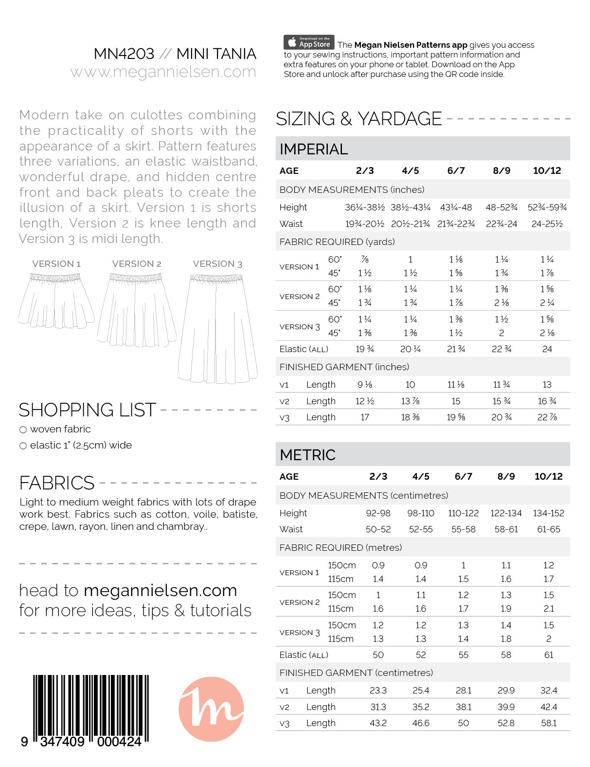 Modern take on culottes combining the practicality of shorts with the appearance of a skirt. Pattern features three variations, an elastic waistband, wonderful drape, and hidden centre front and back pleats to create the illusion of a skirt.