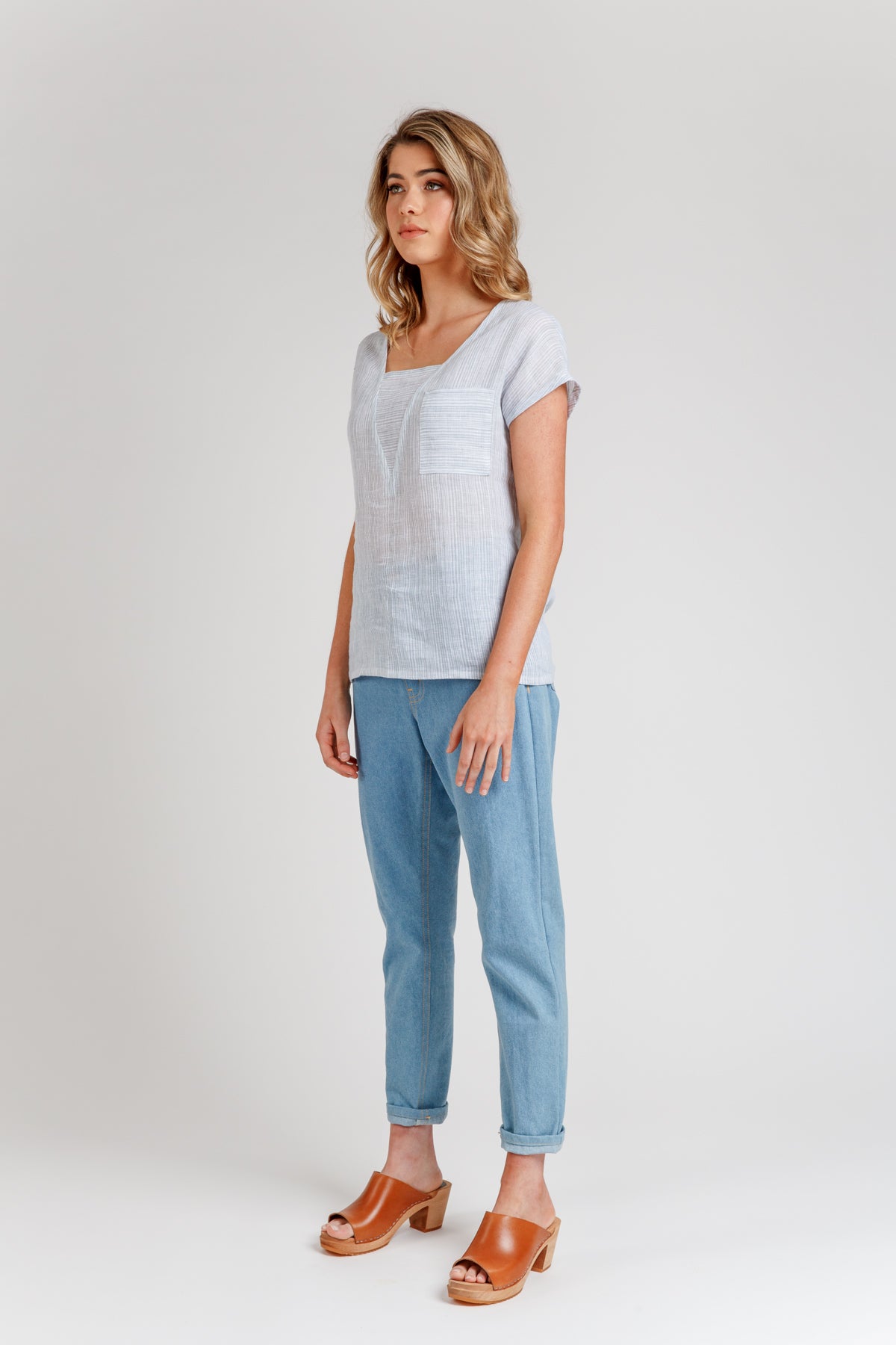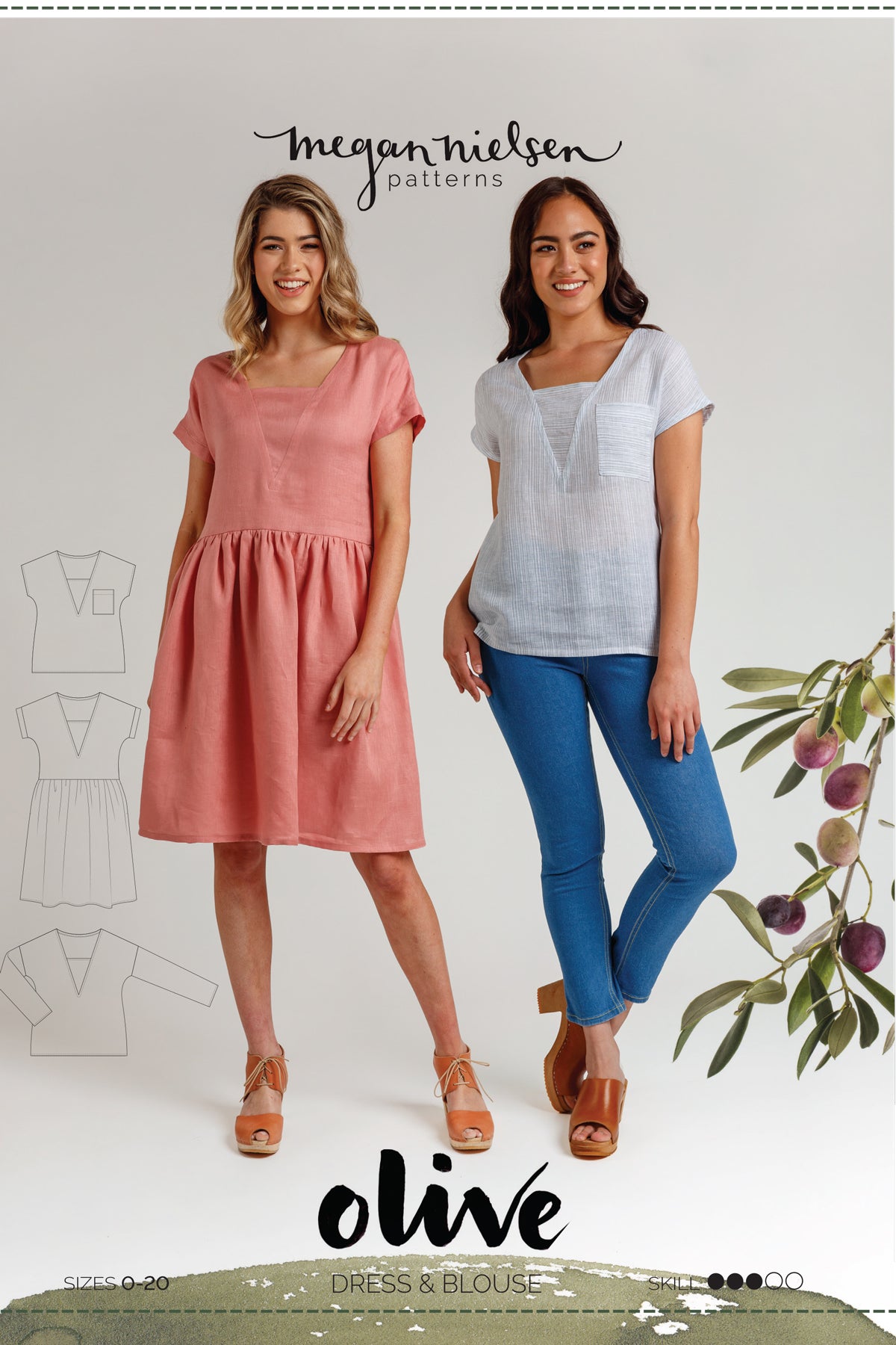 Olive is a relaxed silhouette top or dress with v-insert. Pattern features a drop shoulder, multiple sleeve finishes, dress or top variations, and optional breast patch pocket.