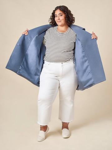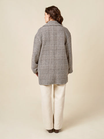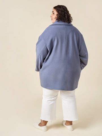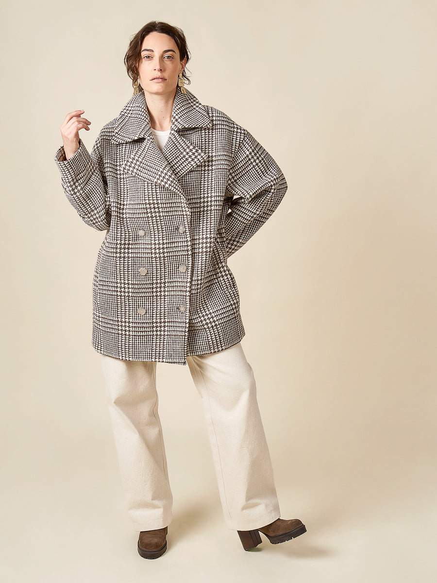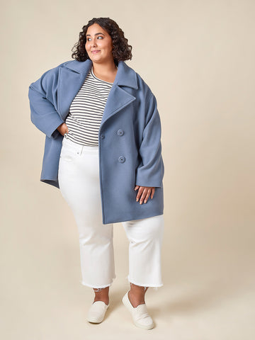 Modern yet timeless, Phoebe is a double-breasted coat with a cocoon shape. Fully lined, it features a dramatic notched collar and lapel that can also be worn closed to stop drafts. The dropped shoulder, roomy two-piece sleeve, and oversized fit make this coat ideal for layering over bulky winter layers. Destined to keep you warm on the coldest of days, this pattern is a great introduction to sewing tailored garments.