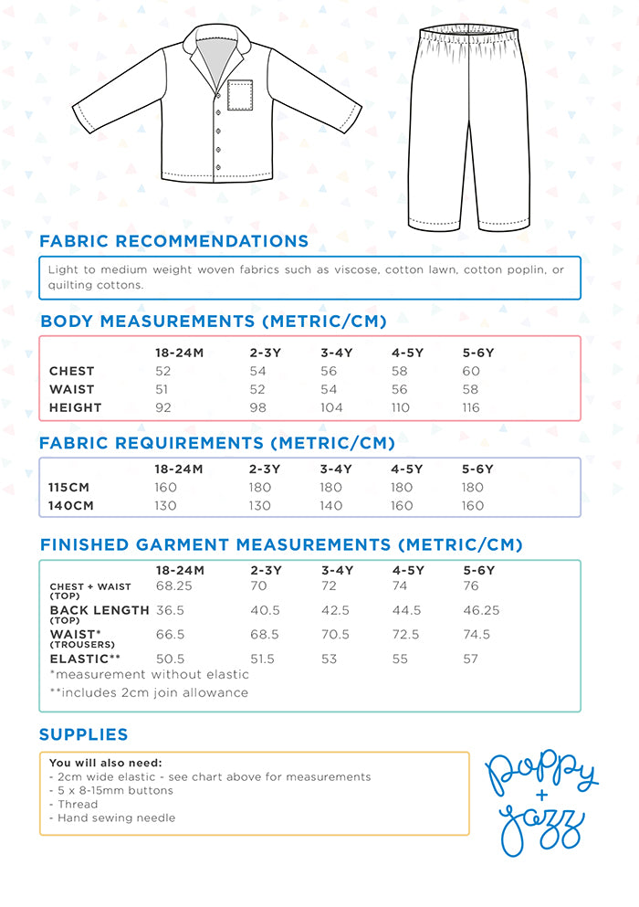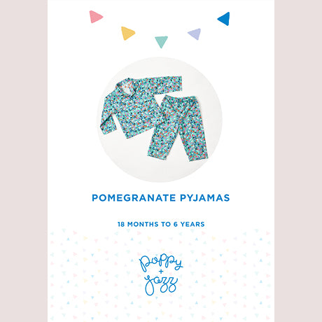 The Pomegranate Pyjamas are a classic pyjama with simplified details for mini people. The top features a notched collar, button front and chest pocket, while the bottoms are straight legged with an elasticated waist for comfort. Best sewn in breathable cottons, the Pomegranate Pyjamas are an Advanced Beginner/Intermediate level pattern, although a beginner could confidently sew up the bottoms.