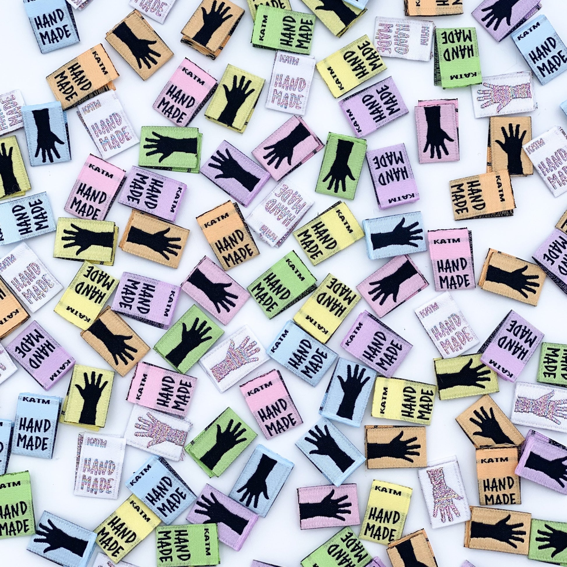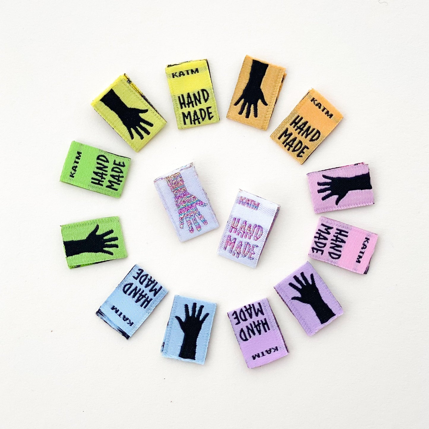 Each pack contains 14 woven labels, 2 of each colour - pink, orange, yellow, green, blue, purple, and white with rainbow metallic threads. Each label is double sided, one side has HAND MADE and the other side has a hand silhouette.