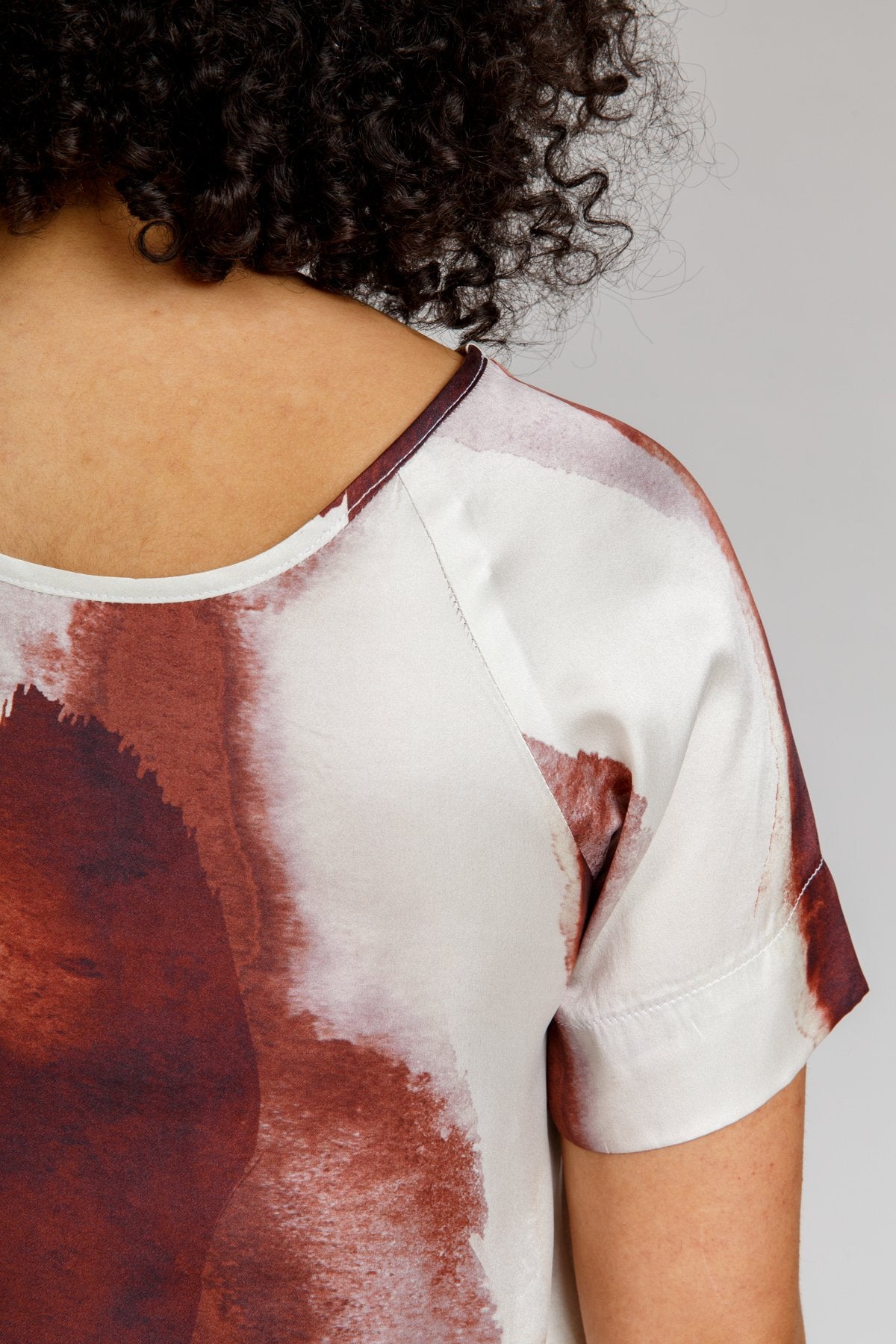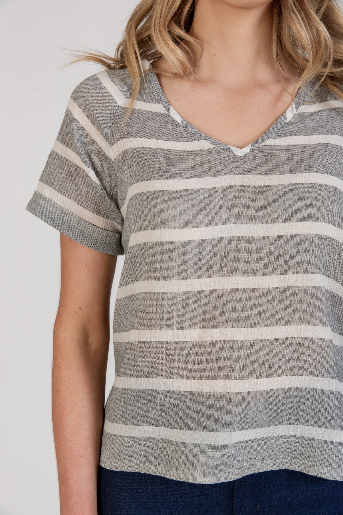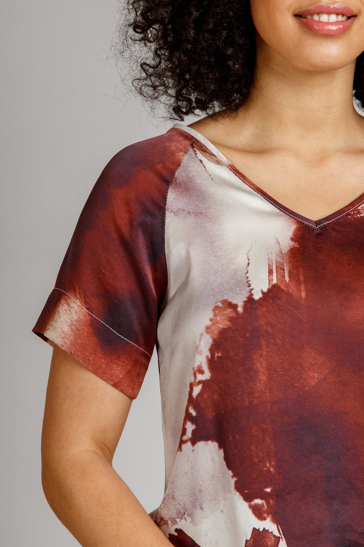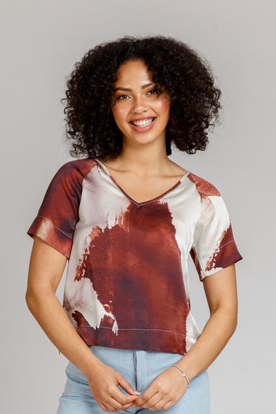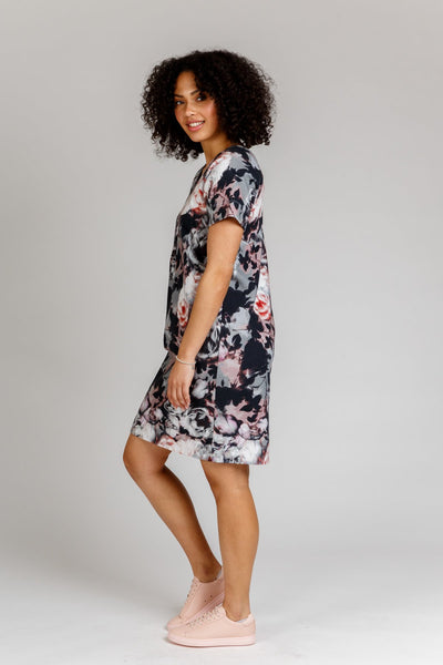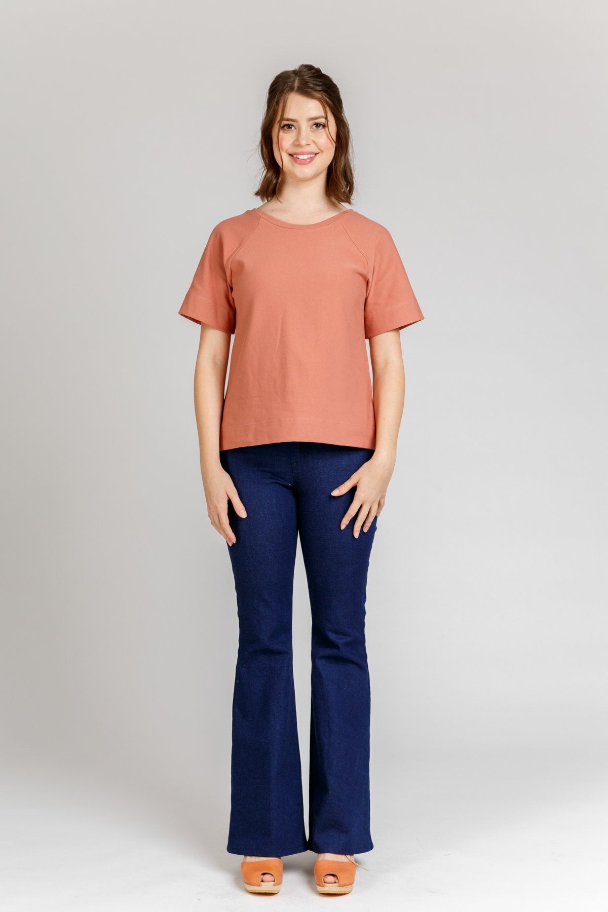 Reversible raglan dress or top that can be made in woven or knit fabrics. Pattern features loose fit, optional pockets and waist tie, as well as top and dress options. It can be worn with the V neck or the round neck side at the front.