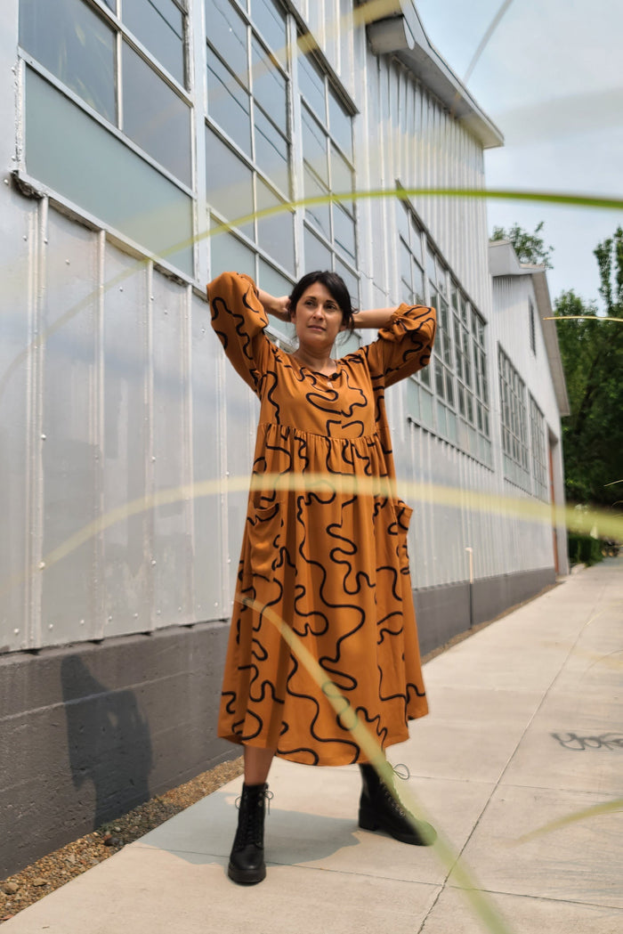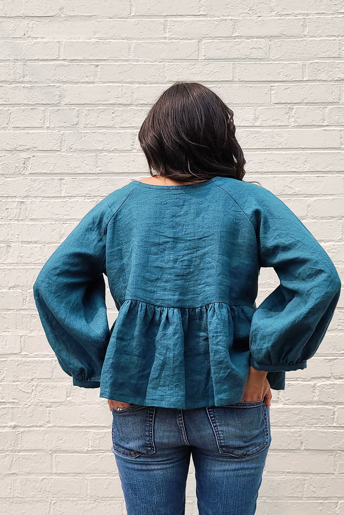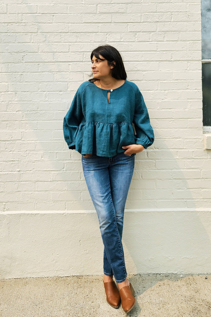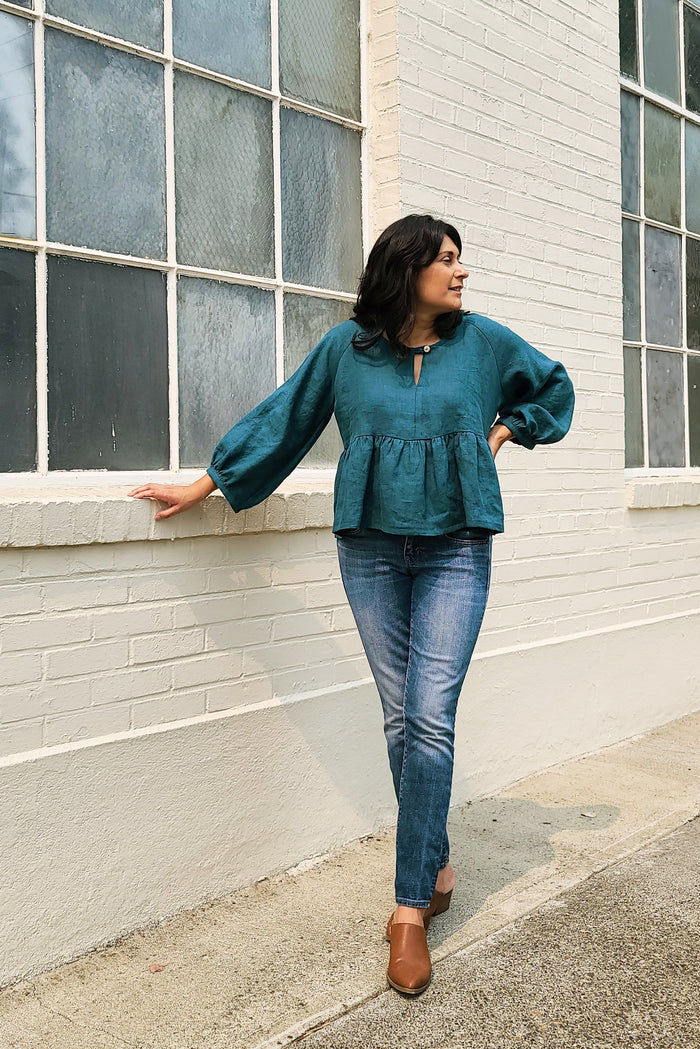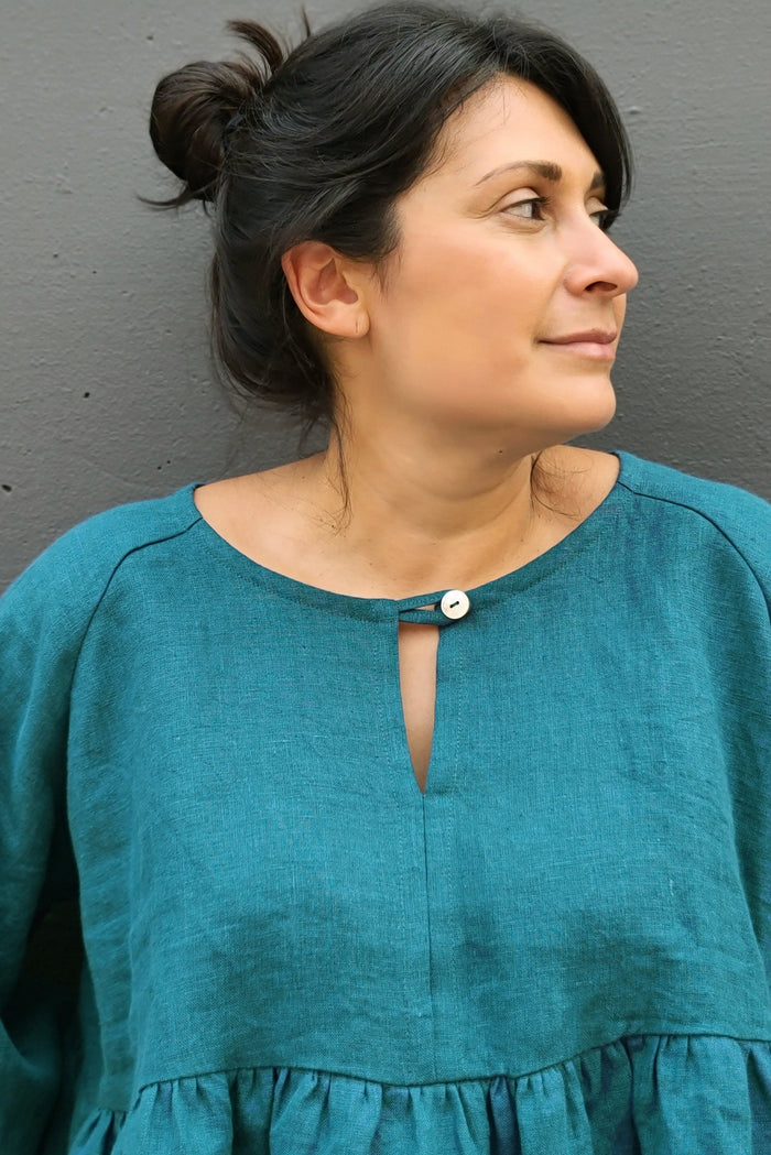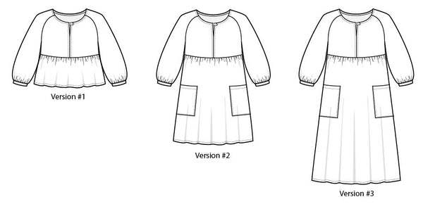 The Romey Gathered Dress & Top pattern is inspired by our beloved Remy Raglan pattern. Beginning with the signature Remy keyhole neckline and loose fit, we shortened the waistline into an elegant empire waist with a gathered skirt or peplum and billowy gathered sleeves at bracelet length. Both dress versions include patch pockets.