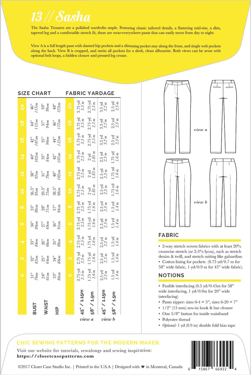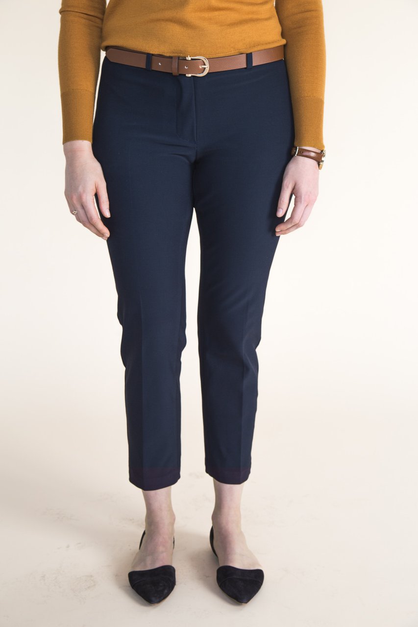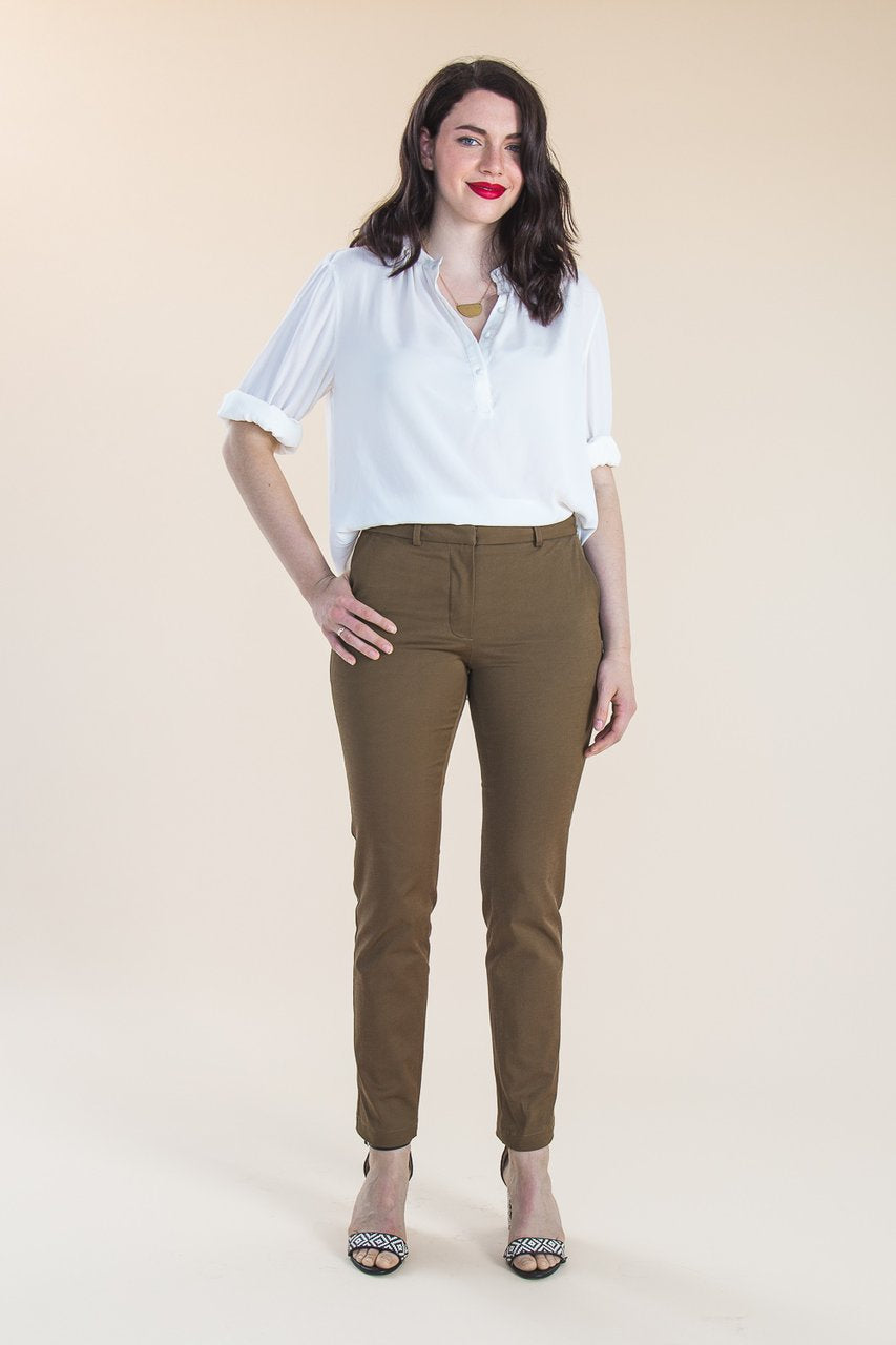 View A is a full-length pant with slashed hip pockets and a slimming pocket stay along the front, and single welt pockets at the back. View B is cropped, and omits all pockets for a sleek, clean silhouette. Both views can be sewn with optional belt loops, a hidden closure and pressed leg crease.