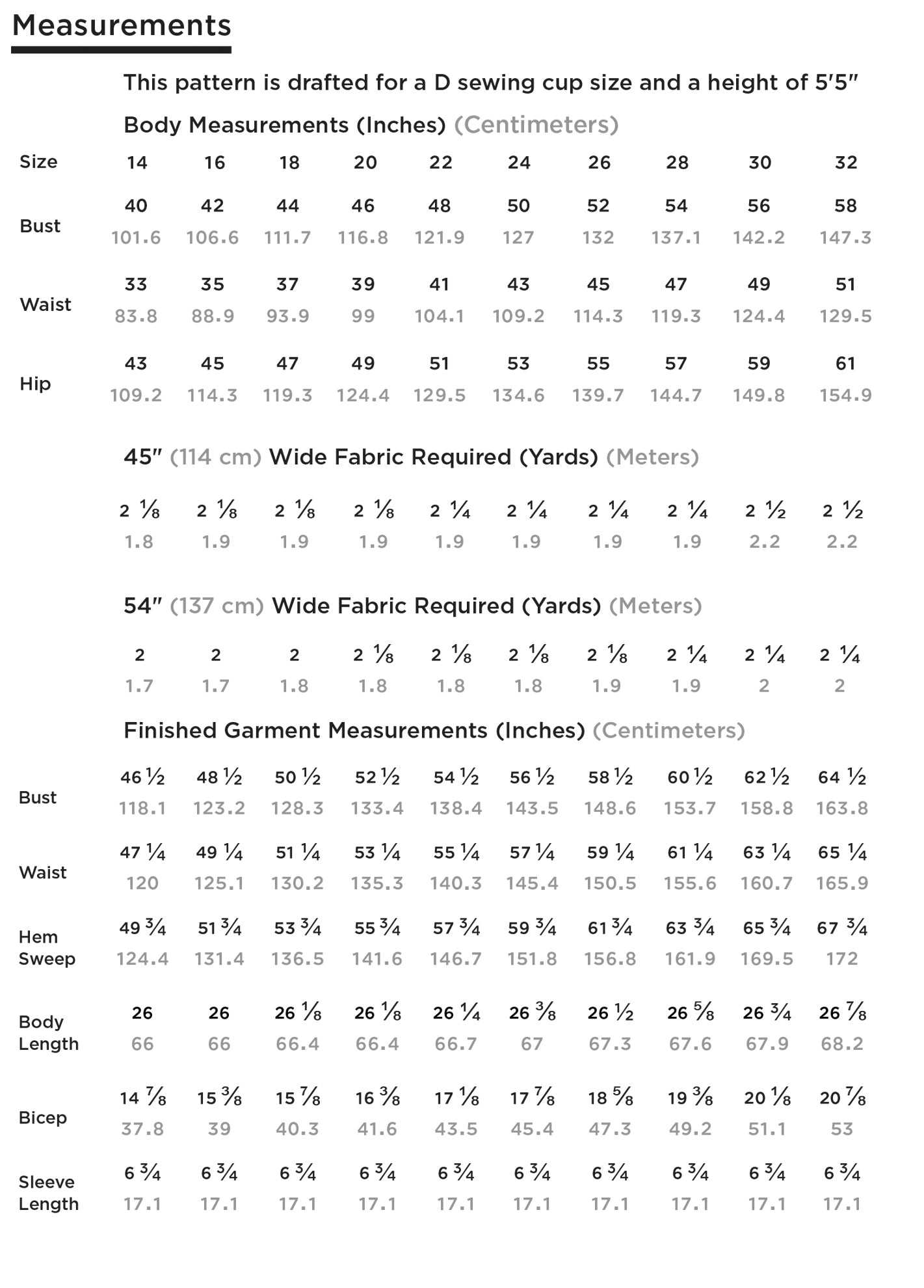 Includes sizes 14 - 30 (40" bust - 56" bust).