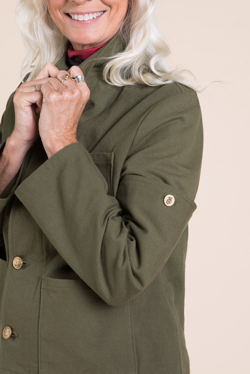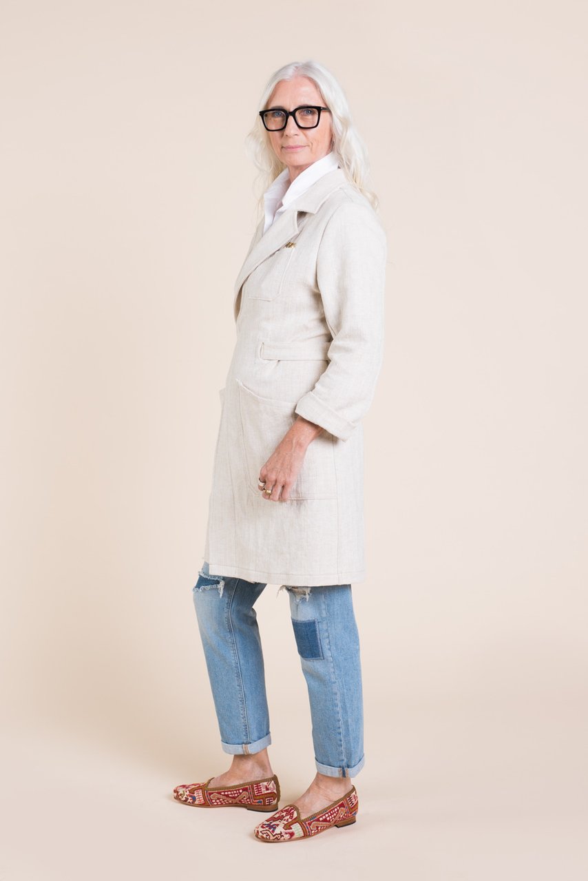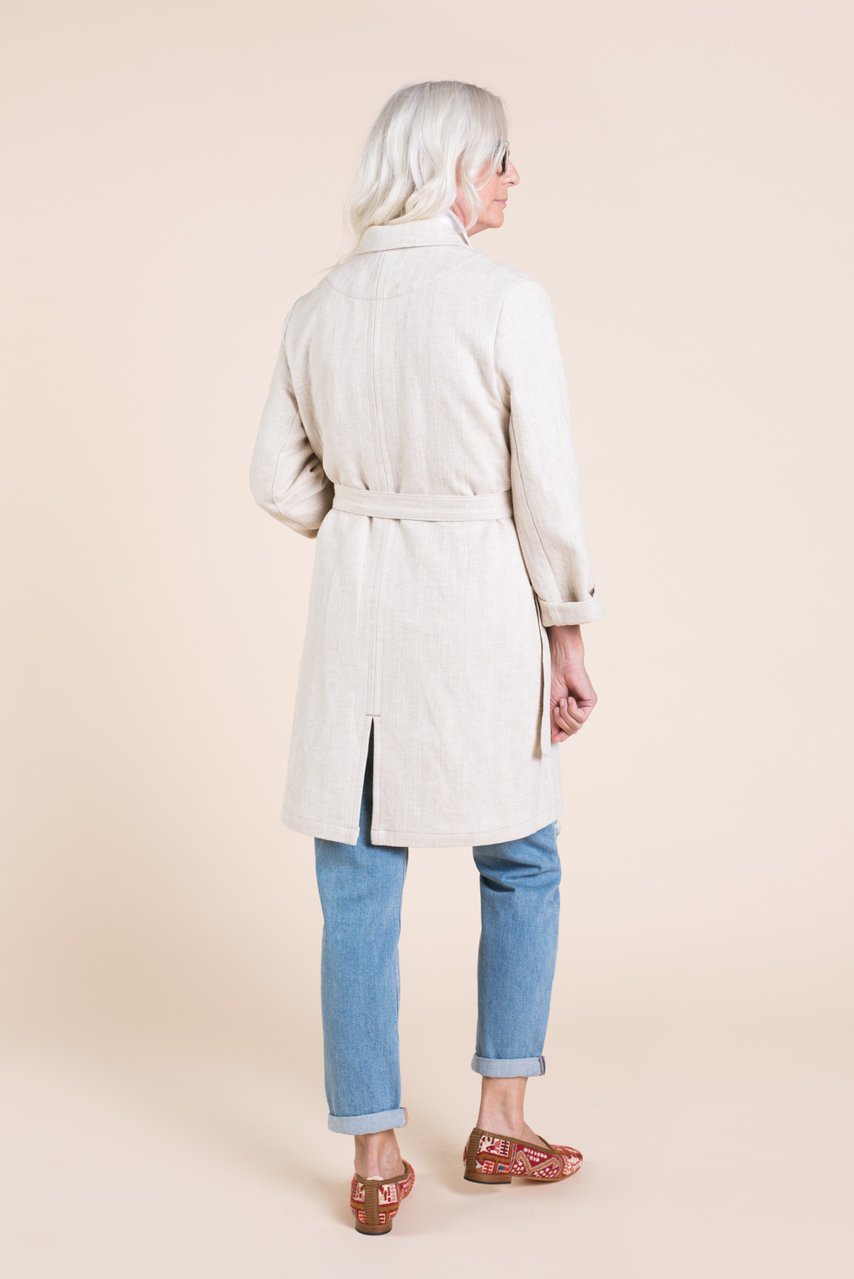 With a slightly dropped shoulder, Sienna features a crisp notched collar which can be worn buttoned at the neck with an optional snap button. It is unlined and finished with durable seams. Views A & B feature deep hip pockets, a hidden breast pocket and waist-cinching belt with D ring closure that can be worn closed, or open by looping the belt in the opposite direction; View A hits at mid thigh and View B ends at upper thigh. View C is a short chore jacket with button closure, optional sleeve pockets and a back button placket.