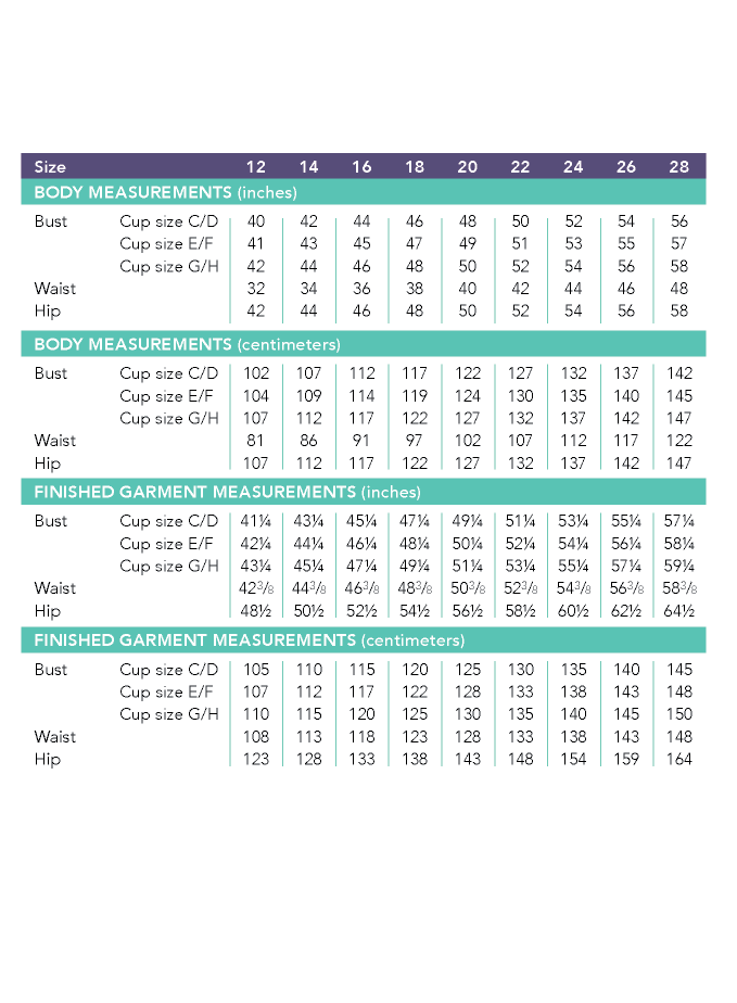 Includes sizes 12 to 28 (waist sizes 32" - 48" / 81cm - 122cm), in three cup sizes (C/D, E/F, G/H).