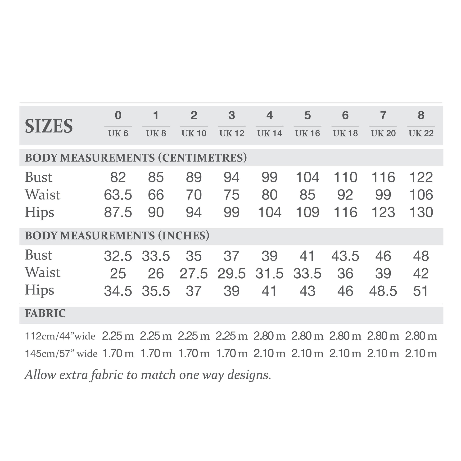 Includes sizes UK 6 - 22 (bust sizes 82cm - 122cm).