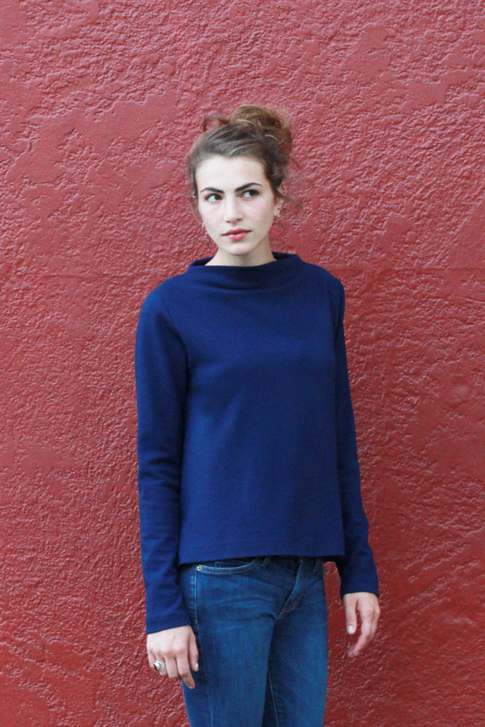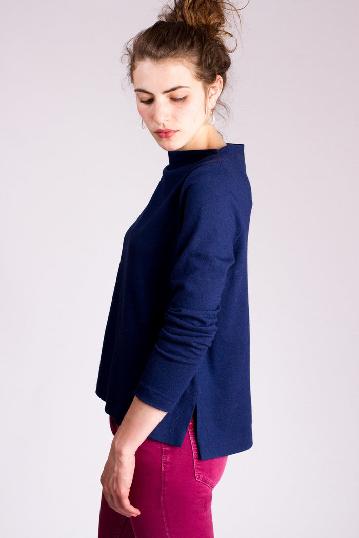 Sweater #1: Is a closer fitting, semi-cropped sweatshirt/sweater. It works best when sewn in thick, stiff knits with some body to keep the neck standing upright. It features raglan sleeves, a wide waistband, a loose turtleneck, long cuffs and falls between the high and low hip. It’s great in a standard sweatshirt fleece (with stretch) however, it’s also extremely handsome in a sweater knit to dress it up a bit.