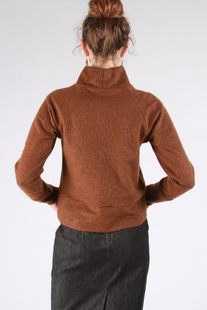 Sweater #2: Is an easy top/sweater that can be dressed up or down. It is somewhat fitted through the shoulders and sleeves and then swings out a bit at the underarms and hem. It features a semi-high-neck that takes its inspiration from funnel and boat necks. It also has mitered side vents with a hi-low hem that is 1” shorter in the front than the back. The front hem falls just below the high hip. Sew it in a boiled wool knit, a wool jersey or ponte for a more dressed up look. Sew it in a sweatshirt fleece (with stretch) or jersey knit for a more casual look.