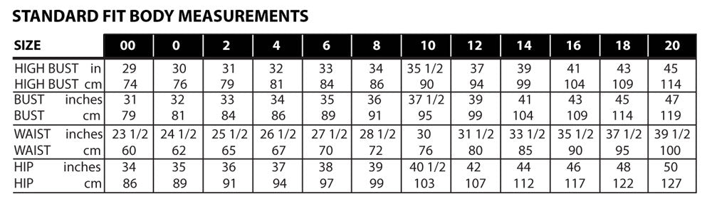 Includes sizes 00 - 20 (bust sizes 31" - 47" / 79cm - 119cm).