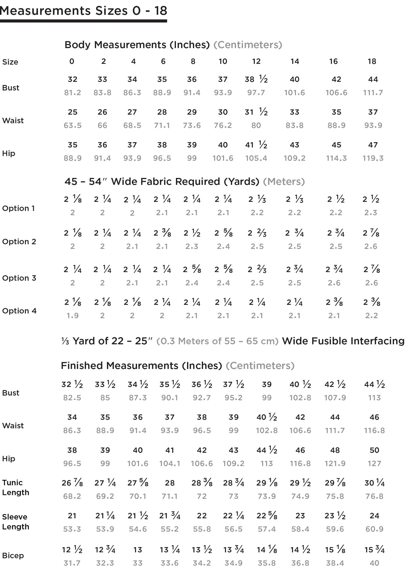 Includes sizes 0 - 18 (bust sizes 32" - 44").