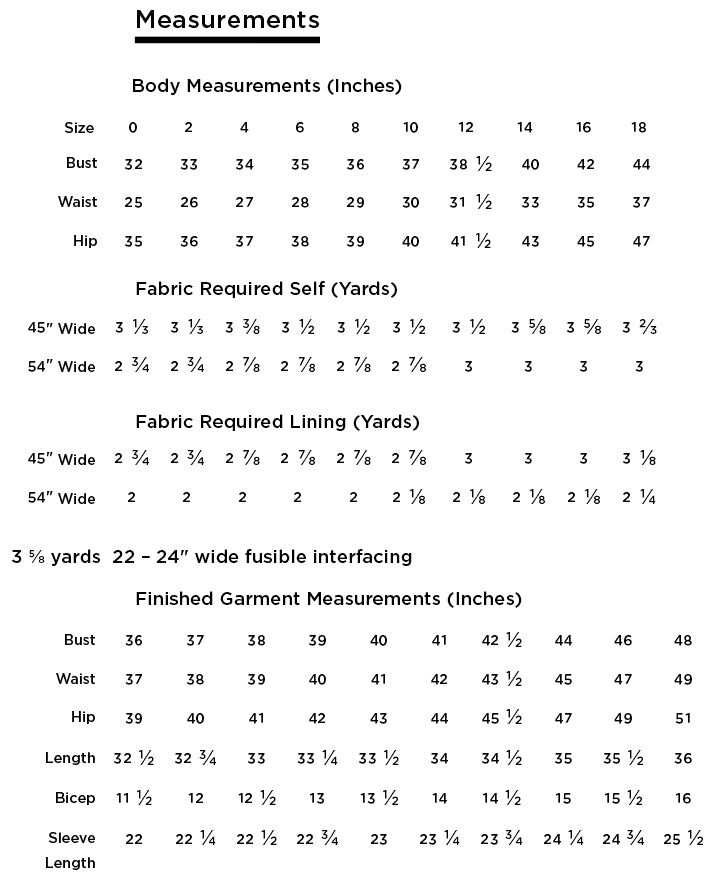 Includes sizes 0 - 18 (bust sizes 32" - 44").